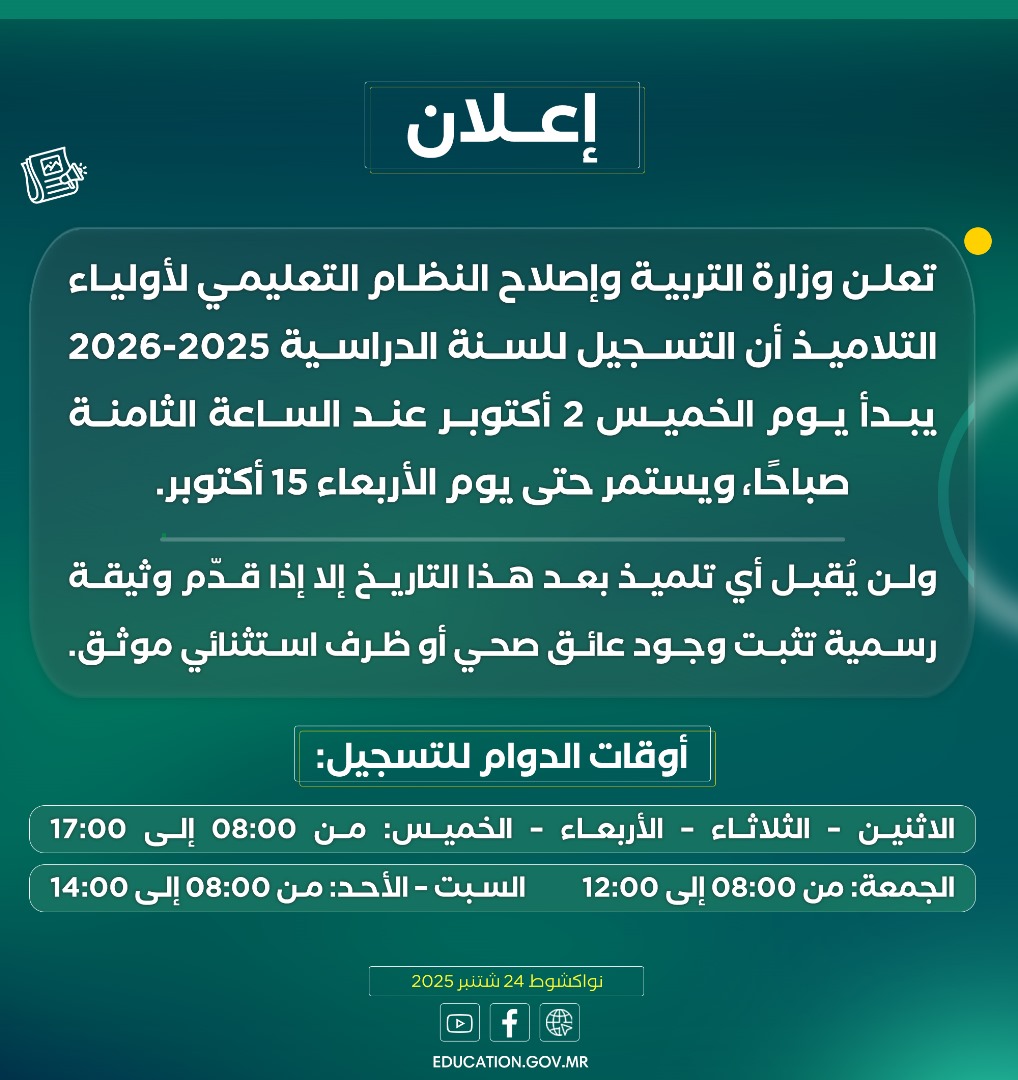 وأكدت الوزارة أن أي تسجيل خارج هذا الأجل لن يُقبل إلا إذا قدم ولي الأمر وثيقة رسمية تثبت وجود عائق صحي أو ظرف استثنائي موثق حال دون إكمال الإجراءات في الوقت المحدد.