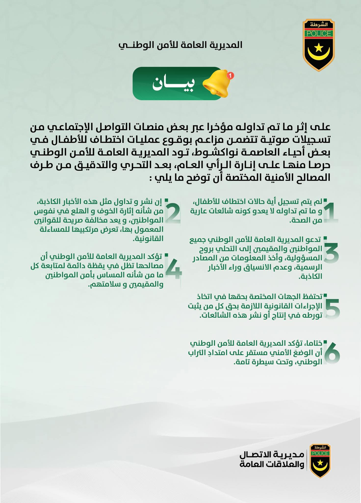 نفت المديرية العامة للأمن الوطني المعلومات المتداولة على وسائل التواصل الاجتماعي بشأن وقوع عمليات اختطاف للأطفال في بعض أحياء العاصمة نواكشوط.
