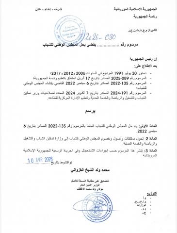 وبحسب المرسوم رقم 080-2026 فقد تقرر إنهاء مهام المجلس الذي أنشأ سنة 2022 مع تحويل ممتلكاته وأصوله والتزاماته إلى وزارة تمكين الشباب والتشغيل والرياضة والخدمة المدنية.