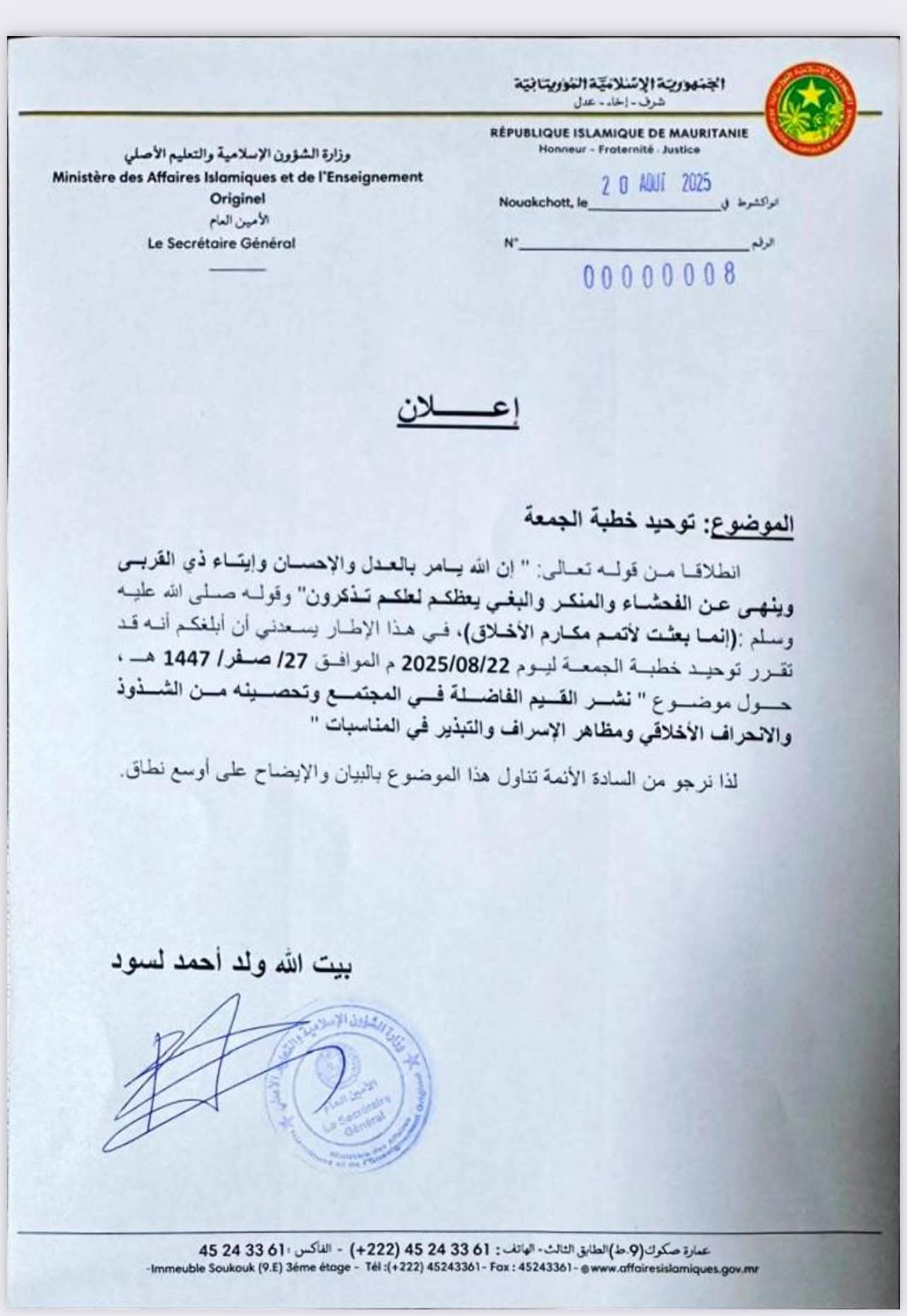 أعلنت وزارة الشؤون الإسلامية توحيد خطبة الجمعة المقبلة، على أن يكون موضوعها: "نشر القيم الفاضلة في المجتمع، وتحصينه من الشذوذ والانحراف الأخلاقي، ومظاهر التبذير والإسراف في المناسبات."
