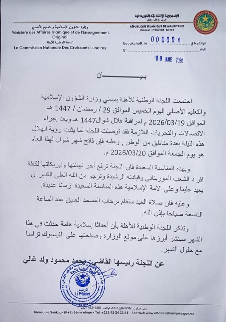 وقالت اللجنة في بيان إنها وبعد إجراء الاتصالات والتحريات اللازمة توصلت لما يثبت رؤية الهلال هذه الليلة بعدة مناطق من الوطن، مشيرة إلى أن صلاة العيد ستقام برحاب المسجد العتيق بنواكشوط الساعة التاسعة صباحا، بإذن الله.