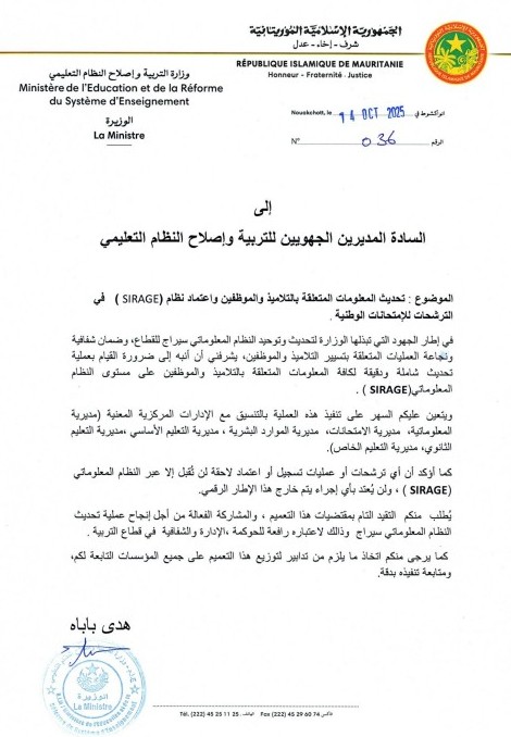 وأكدت وزيرة التربية هدى باباه، في التعميم على أن أي ترشحات أو عمليات تسجيل أو اعتماد لاحقة لن تقبل إلا عبر النظام المعلوماتي (سراج) ولن يتعد بأي إجراء يتم خارج هذا الإطار.