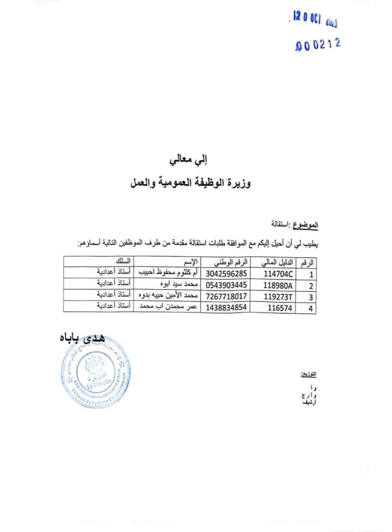 وكان عمر محمدن اب محمد، وهو أحد المدرسين الأربعة، قد أعلن استقالته من التعليم عبر رسالة موجهة إلى وزيرة التربية مطلع شهر أكتوبر الجاري.