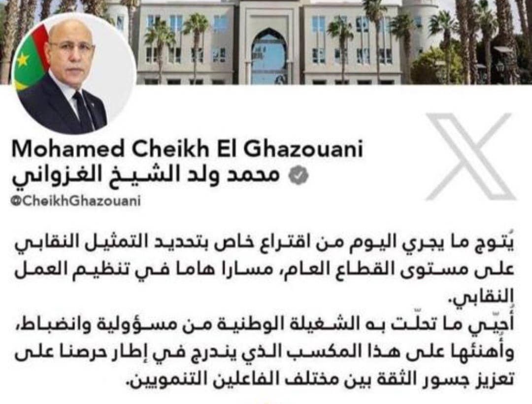 قال رئيس الجمهورية محمد ولد الشيخ الغزواني إن الاقتراع الخاص بتحديد التمثيل النقابي على مستوى القطاع العام يُمثل مساراً هاماً في تنظيم العمل النقابي.