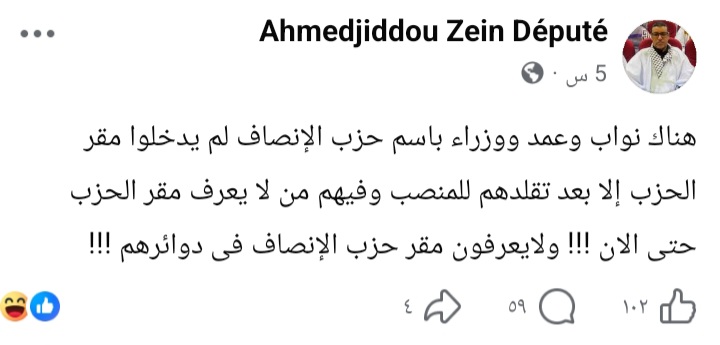 وأضاف ولد الزين، في تدوينة نشرها على حسابه في فيسبوك، أن هناك نوابًا وعمدًا ووزراء باسم الحزب لم يدخلوا مقره إلا بعد تقلدهم المنصب، "وفيهم من لا يعرف مقر الحزب حتى الآن".