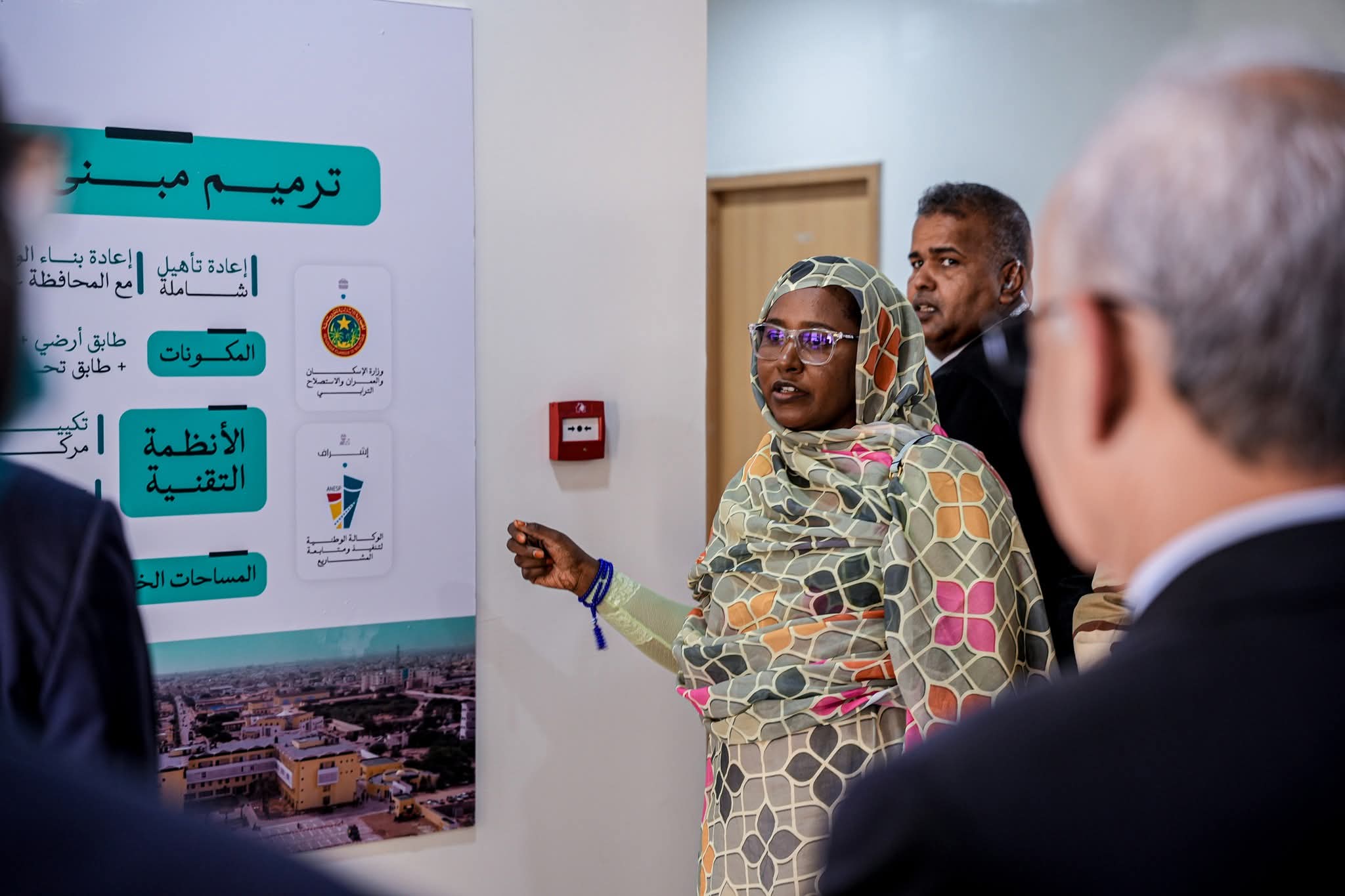 وحول مبنى الحكومة، أوضحت معالي الوزيرة أن ترميمه يعتبر خطوة هامة أعادت لهذا الصرح الحكومي مكانته الرمزية، من خلال إعادة تأهيل شاملة، مع احترام الطابع المعماري الأصلي للواجهة الخارجية، واعتماد تصميم داخلي حديث يقوم ـ كما تابعتم قبل قليل في الفيلم ـ على حسن توزيع المكاتب والاستغلال الأمثل للمساحات. وقد أشرفت الوكالة الوطنية لتنفيذ ومتابعة المشاريع على تنفيذه، بالتعاقد مع الهندسة العسكرية بالأركان العامة للجيوش الوطنية، بكلفة إجمالية شاملة للضرائب ناهزت 238 مليون أوقية جديدة.