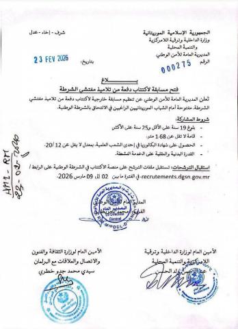 وأوضح البلاغ أن استقبال الترشحات يتم غبر منصة الاكتتاب في الشرطة الوطنية، في الفترة ما بين 02 إلى 09 مارس 2026.