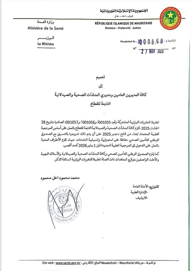 أصدرت وزارة الصحة تعميماً موجهاً إلى جميع المنشآت الصحية والصيدلانية التابعة للقطاع، يتعلق بتطبيق التحيين الجديد للمرجعية الطبية الوطنية، تنفيذاً لجملة من المقررات الوزارية الصادرة في 28 أغسطس 2025.