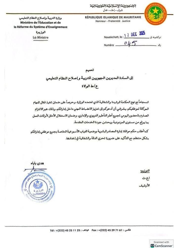 وطالبت الوزارة المديرين الجهويين للتربية بتعزيز الانضباط المهني داخل إداراتهم، وذلك عبر الالتزام الصارم بالحضور اليومي لجميع أطر التأطير التربوي والإداري.